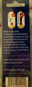 I just removed the spray nozzle from one of my perfume bottles and then placed the Travalo on top and it worked perfectly! Now I have 50+ sprays (so says the packaging) and I never had to touch/spray/pour the perfume…SHEER GENIUS!