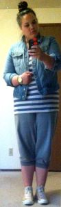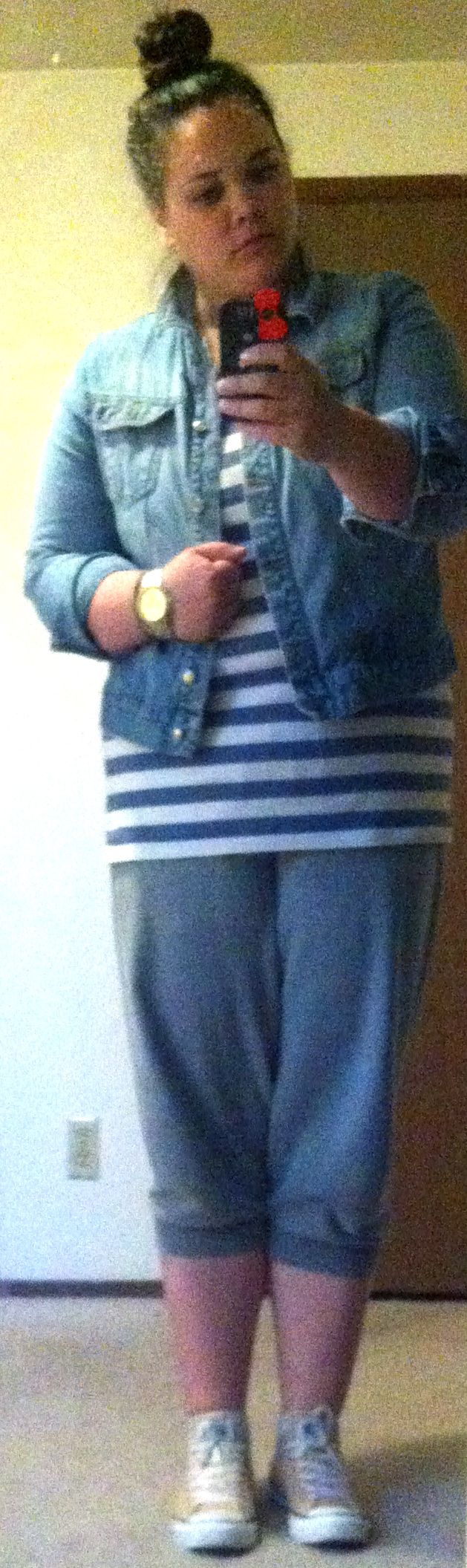 So todays uniform consists of a GAP Denim Jacket, Striped Blue and White Racer Back Tank from Old Navy, Heather Grey Cropped Sweat Pants from Forever 21, and then my Nude Converse from Nordstroms. And then I just had to show you a close up of the back of my hair!
