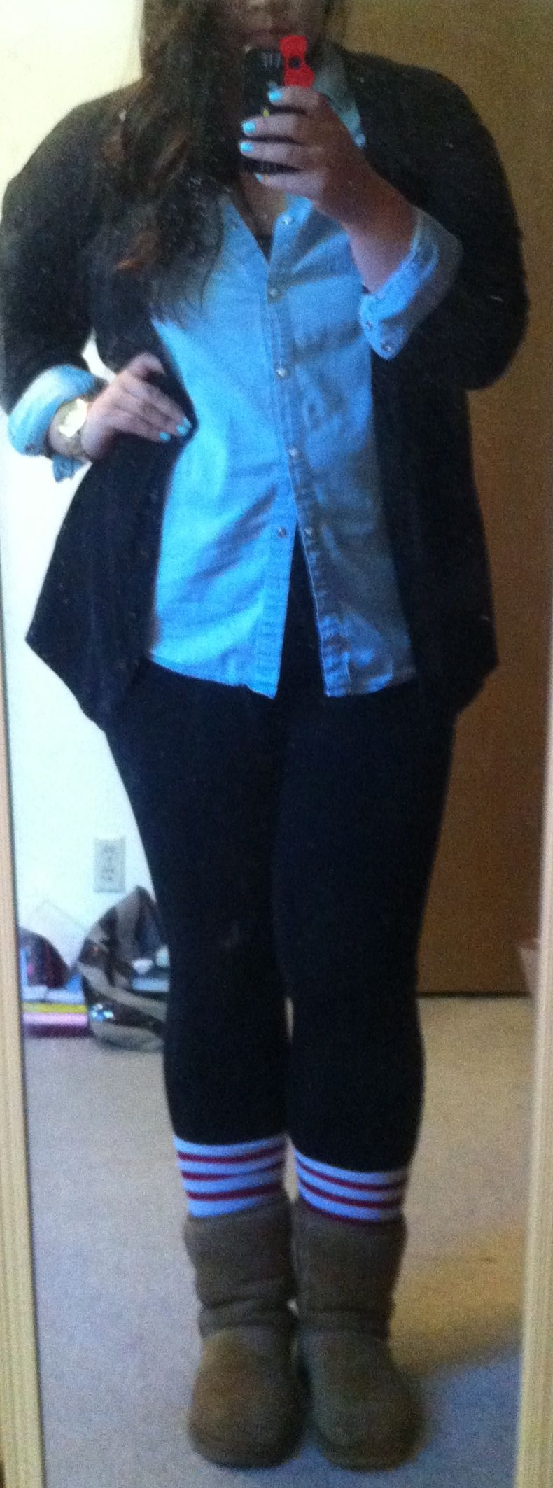 Black Cardigan (Old Navy), Denim Chambray Shirt (Forever 21), Black Leggings (who knows), Red Stripe Athletic Socks (Forever 21), and Uggs (Nordstroms).