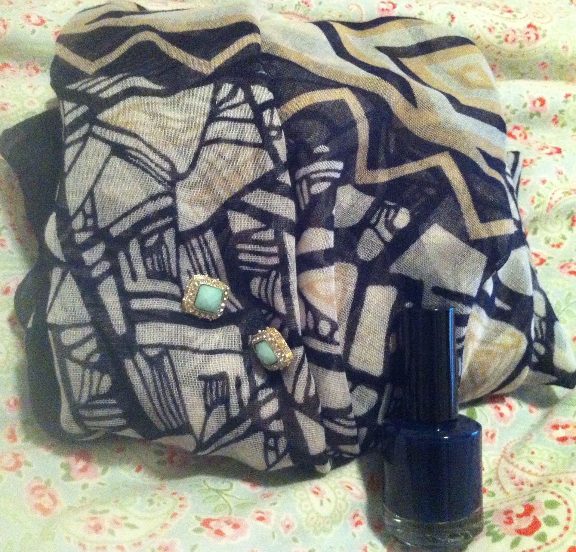 Then from some friends I received a few things from BP: A pretty black, cream & pink geo print scarf, some cute gold and turquoise stud earrings, and a dark blue nail polish.