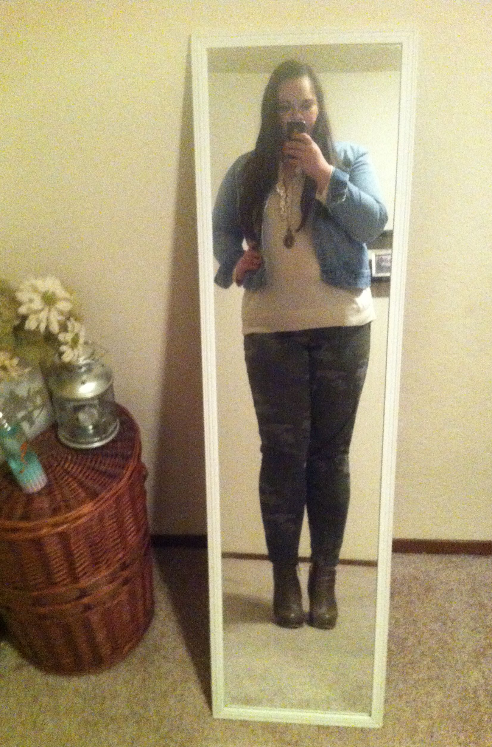(Old Navy Denim Jacket, GAP Cream Ruffle Placket Sweater, GAP Green Camo Skinny Zip Ankle Pant, Dolce Vita Taupe Wedge Booties, Forever 21 Cameo Necklace.)