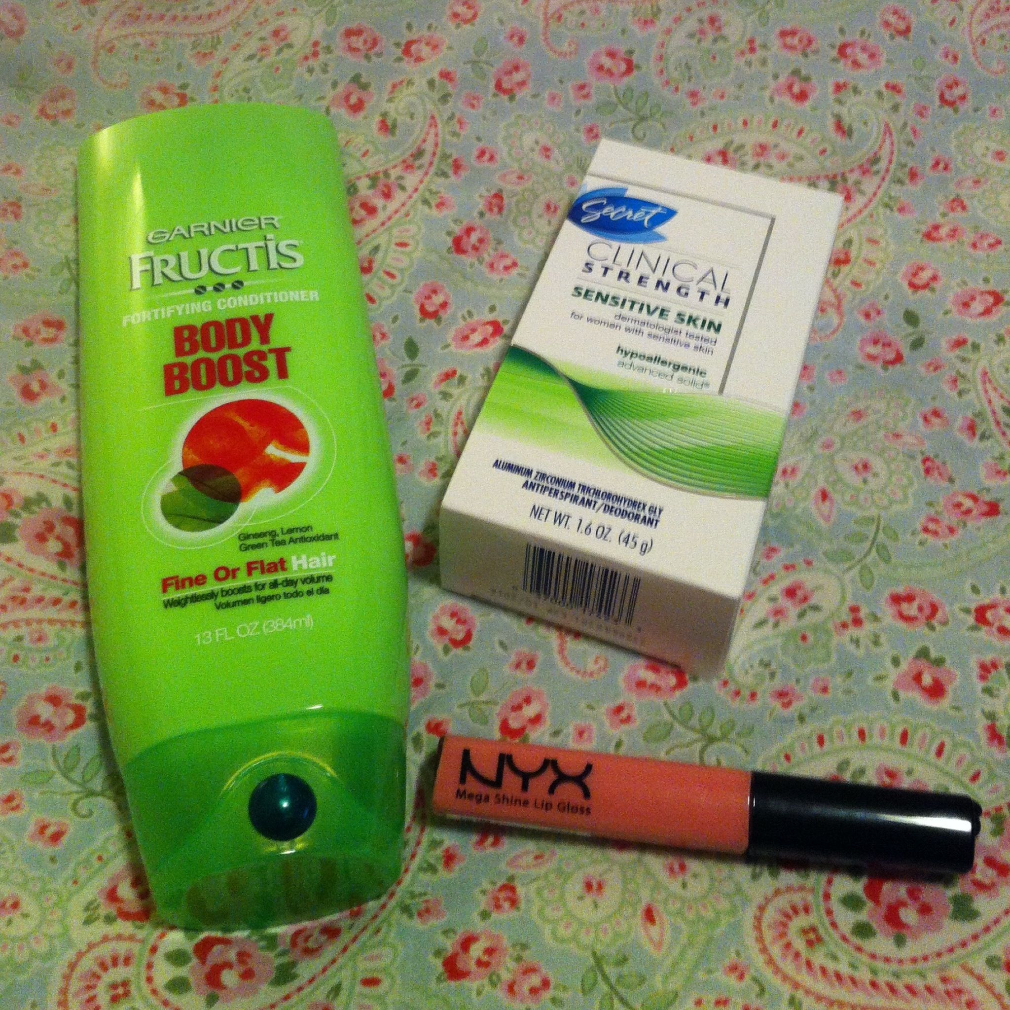 From L to R: Garnier Fructis Hair Conditioner, Secret Clinical Strength Deodorant, and NYX Mega Shine Lip Gloss in color 164 Nude Pink.