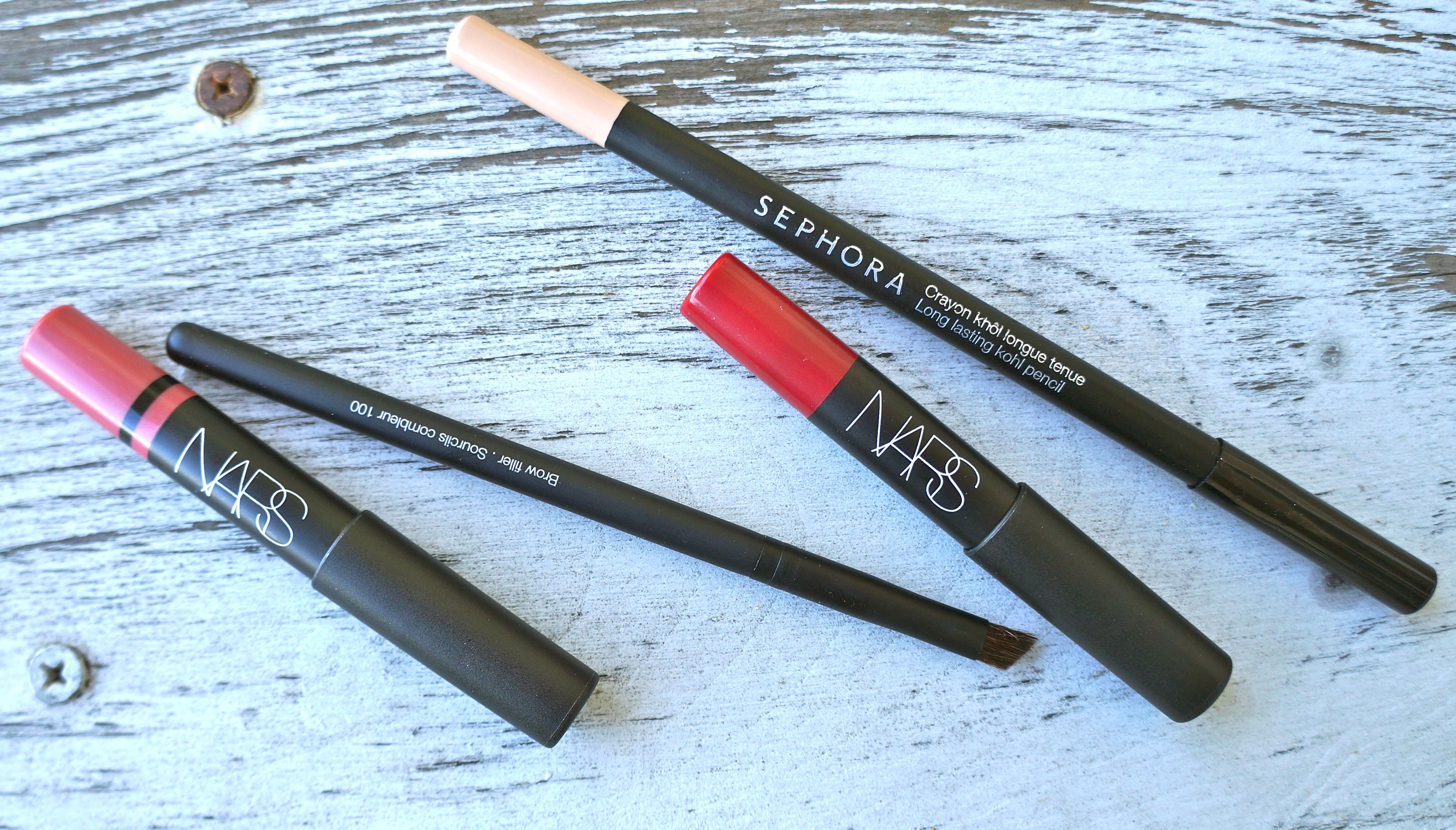 And lastly here (from Left to Right) we have a Nars Satin Lip Pencil in color Rikugien (Rose Pink), a Sephora Brow Filler Brush, another Nars Velvet Matte Lip Pencil in color Cruella (Scarlet Red), and a Sephora Long Lasting Pencil in color Infinite Beige. Both of the Nars Lip Pencils were my Birthday Gift from Sephora, the Brow Brush was something I just needed, and I got the Beige Eyeliner to line my bottom waterline as I was finding the white eyeliner I was using was a little stark for my liking.