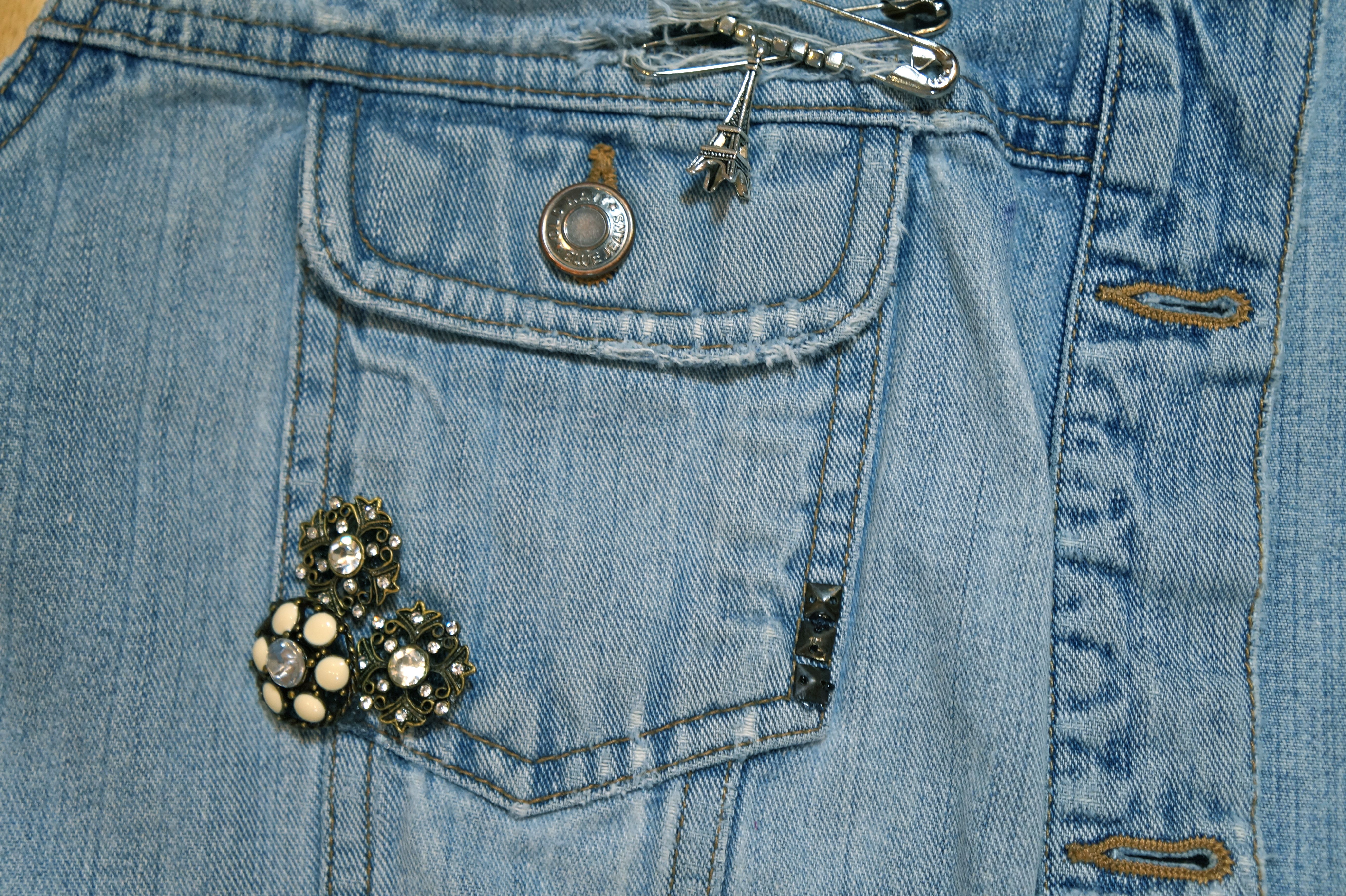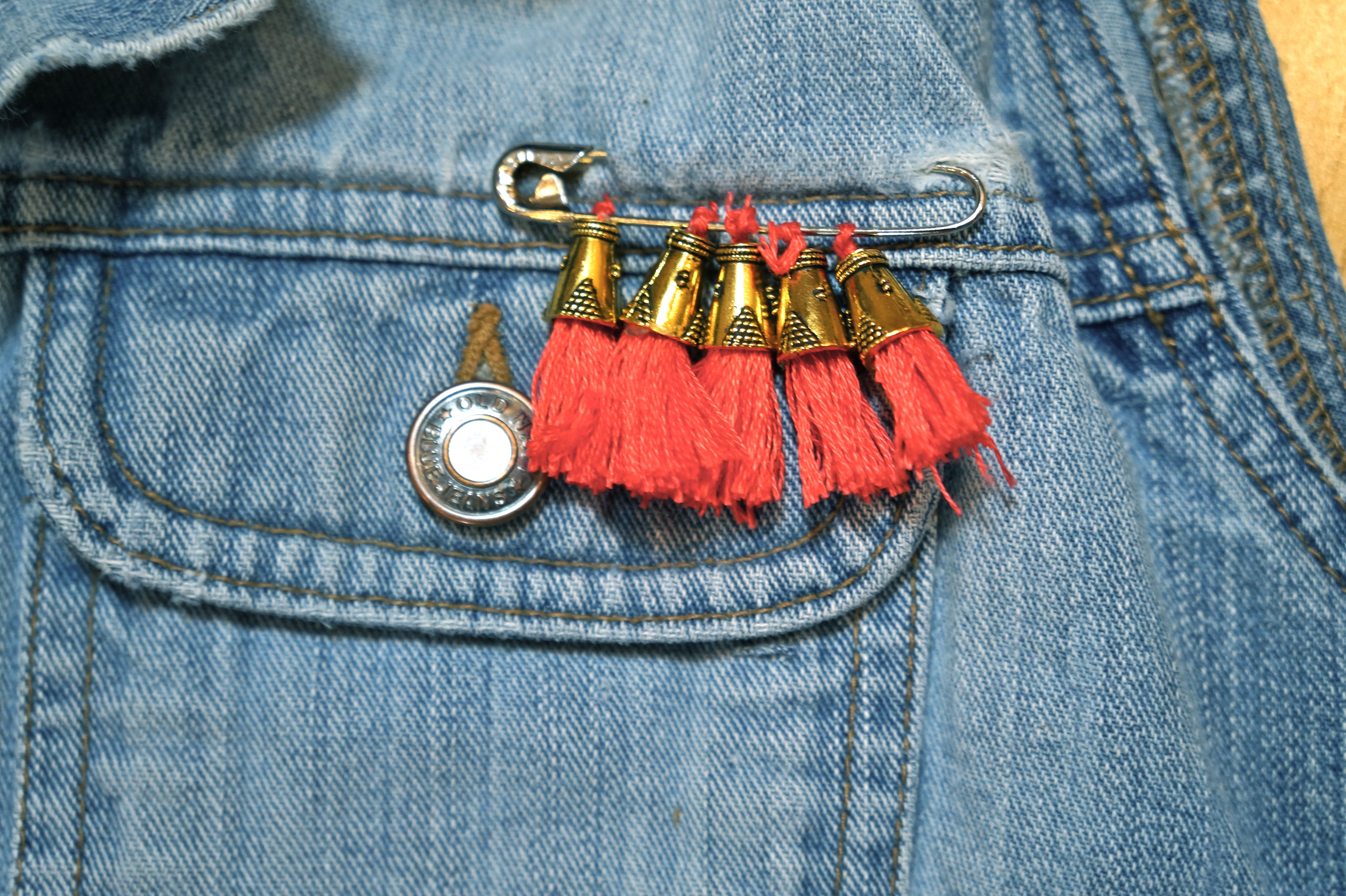I’ve got here some safety pins, string, old buttons, beads, charms, pyramid rivets and this little tassel brooch that I made.