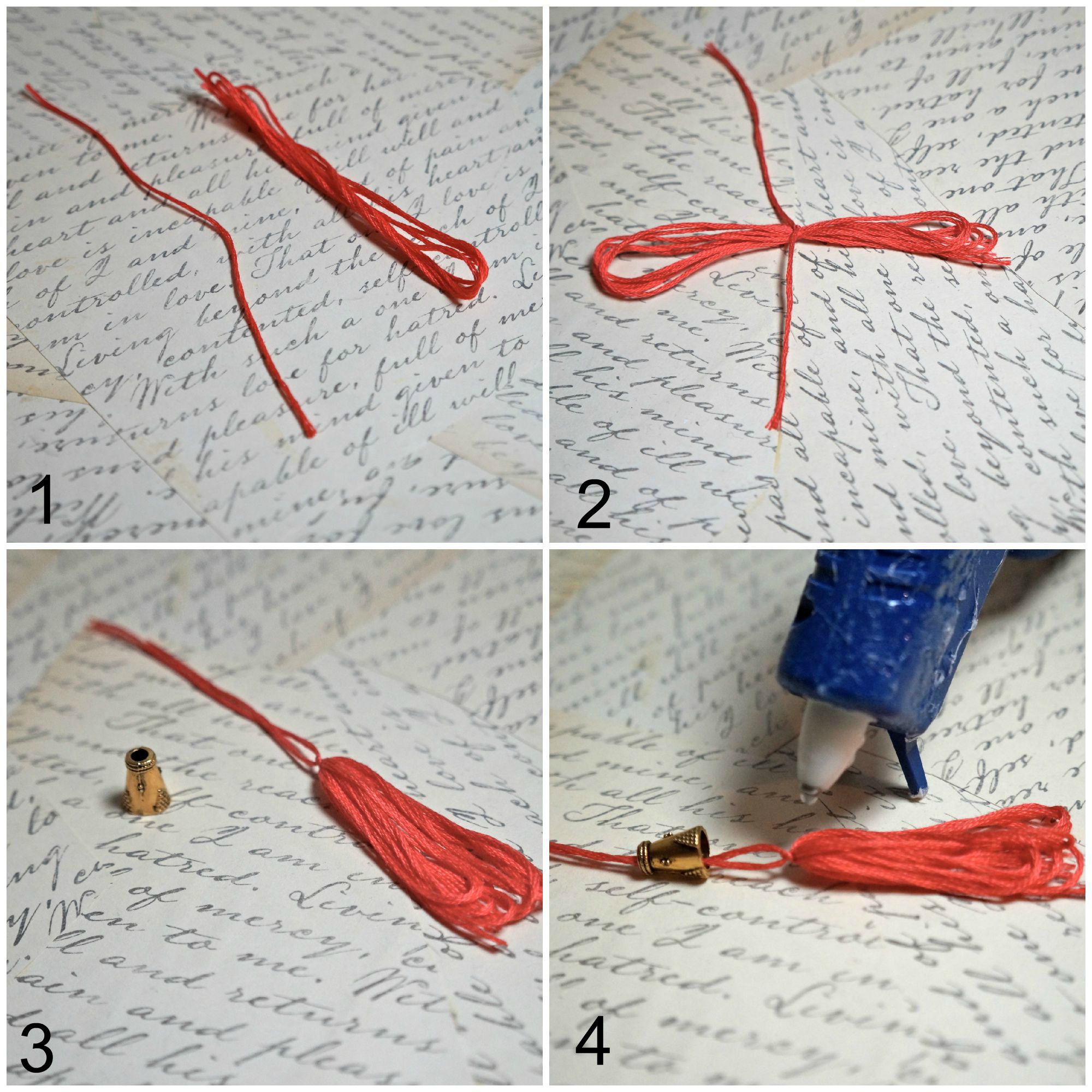 Now to make this tassel brooch all you need is some string, some kind of cap bead, a safety pin and a glue gun. Here is how I did it step by step…